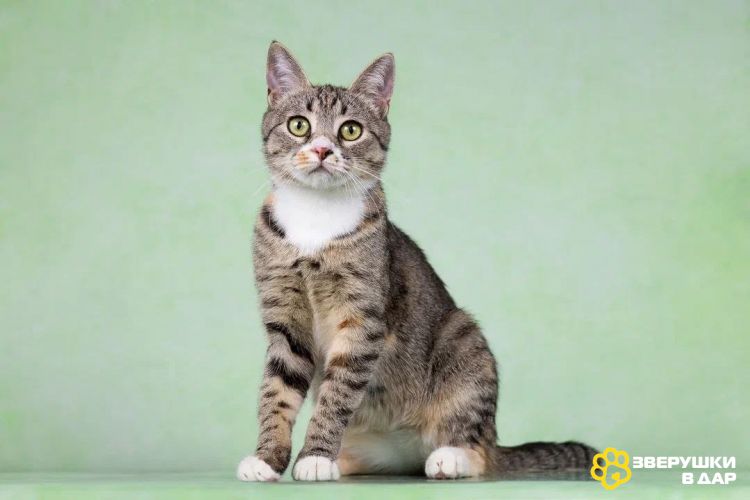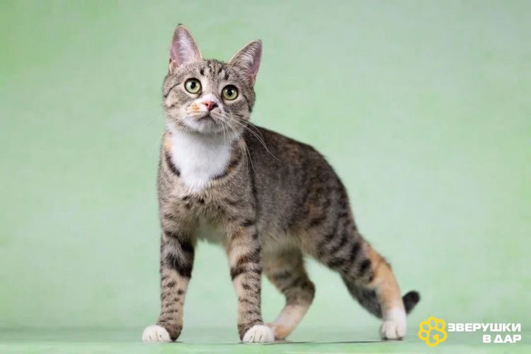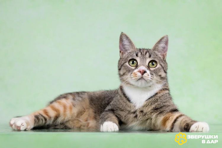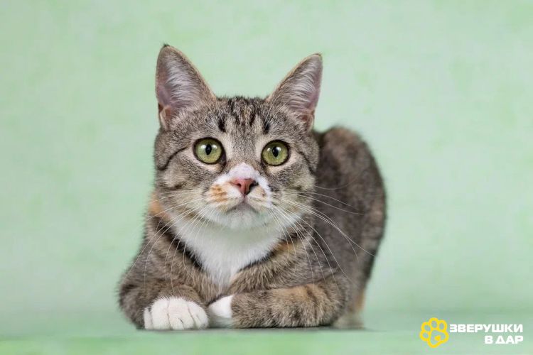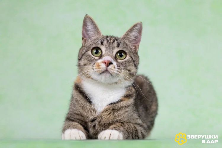 Грейси — не просто кошка. Это маленький комочек счастья, который, завидев человека, тут же начинает мурлыкать, словно пытаясь сказать: «Я здесь, чтобы дарить тепло». Её необычная трёхцветная шубка — словно произведение искусства, нарисованное самой природой, а желто-зеленые глаза просто поражают глубиной.