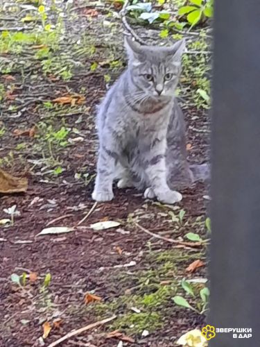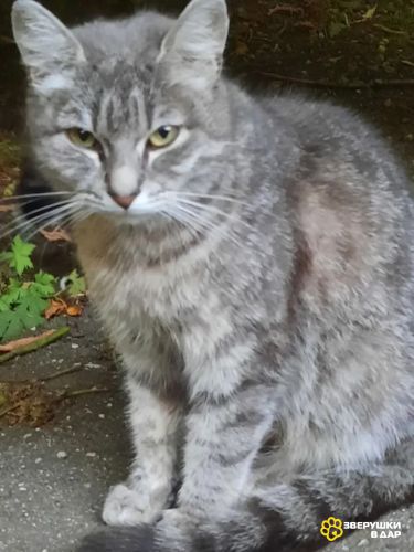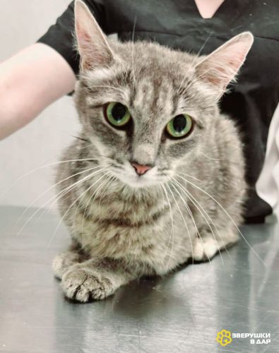 Серебристую красотку с жёлто-зелёными грустными глазами выкинули на территорию психушки, выживала в разрушенной хибаре и в холод, и в жару. Рожала каждые 3 месяца, котята погибали.