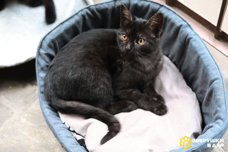 • Девочка (серо-чёрная) — невероятно ласковая, любит сидеть на ручках, обнимается и мурчит так, что сердце тает.