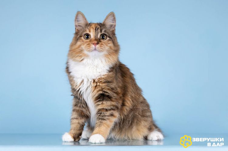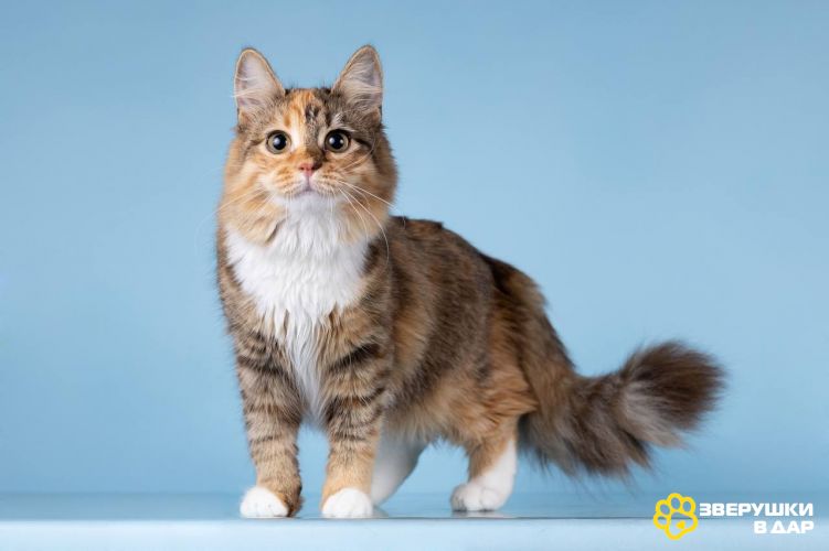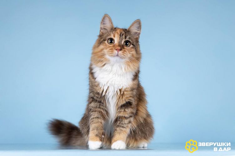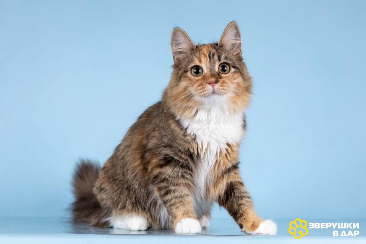 Фиона как нежный пушистый цветочек до того красивая и милая! Густая шелковая шубка счастливой расцветки так и просит её погладить.Фиона ласковая и разговорчивая девчушка. Очень добродушная и милая. А если у Вас уже есть котик, то малышка с ним подружится. Родилась в марте 2025.