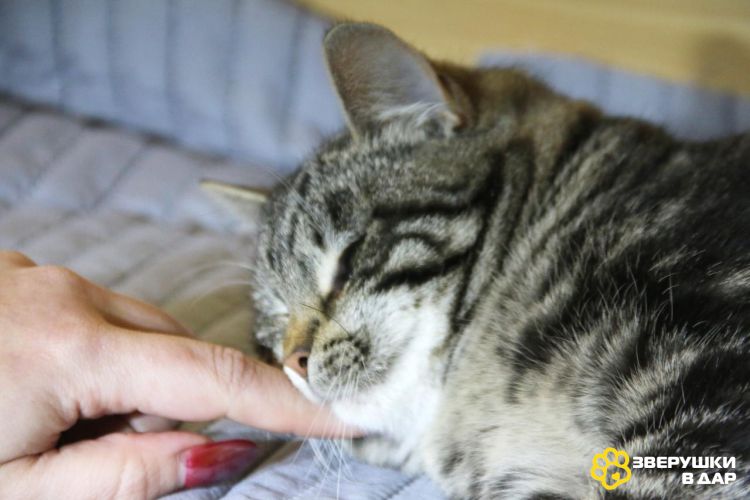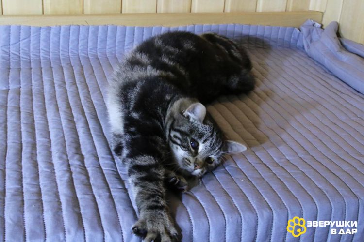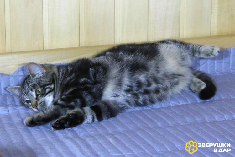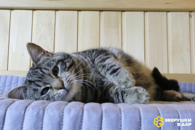Мартин. Котик очень красивого бурундукового окраса с забавными пятнышками на животе. По характеру игривый, но при этом нежный и ласковый, очень любит сидеть на руках и мурчать. Глазик, к сожалению, останется таким, но на очарование этого кота не влияет. Помутнение произошло из-за ринотрахеита, но сейчас котик уже пролечен и всё хорошо. Возраст – 5-6 месяцев, сейчас идет активная смена клыков. Приучен к лотку, обработан от блох и глистов.