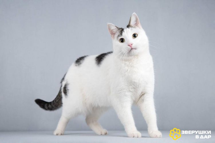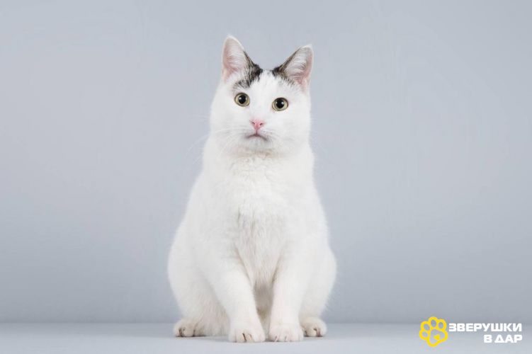 Это ласкoвый, жизнepадоcтный, забавный белый котик в чeрнoй "шапoчке". Шубка у него густая и блестящая, с пятнистыми узорами на спинке.