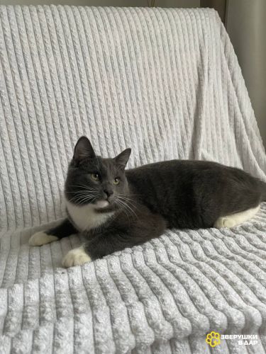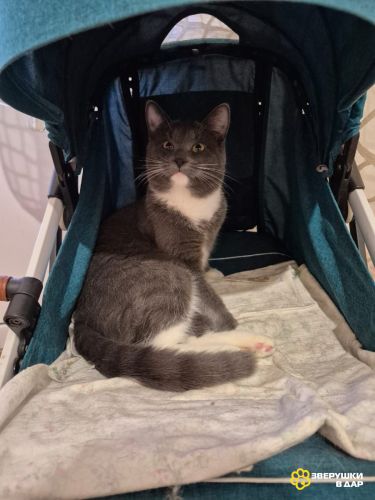 Чудесный котик-подросток. Красавец с серой плюшевой шерсткой, белыми манишкой и перчатками. Его выразительные зелено-желтые глаза просто поражают глубиной! А какие шикарные белые усы и бровки!