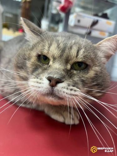 Он красивый, дымчатый в полоску с белыми усиками.