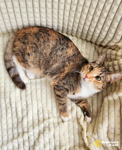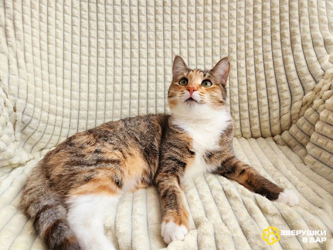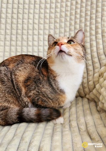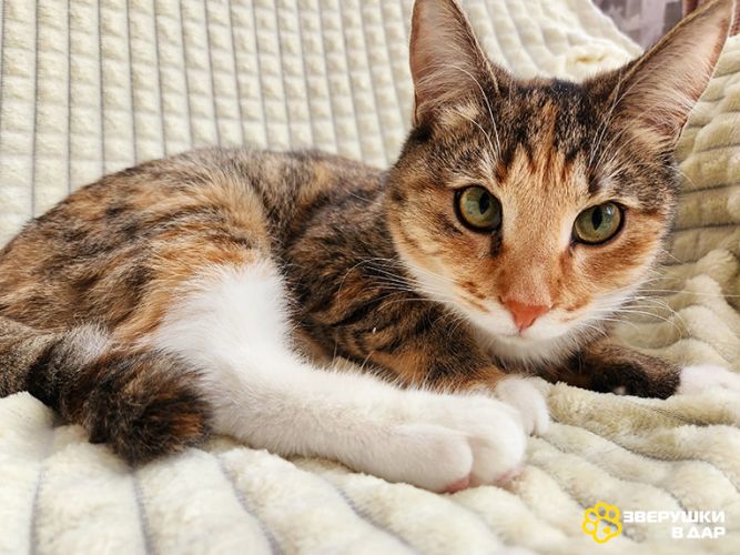 Игривая и ласковая, очень добрая, прекрасно ладит с сородичами, спасена с улицы.