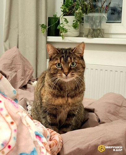Зеленоглазая красавица Верочка обладает мягонькой пёстрой шубкой, фото не передаёт её трехцветного окраса с рыжинкой