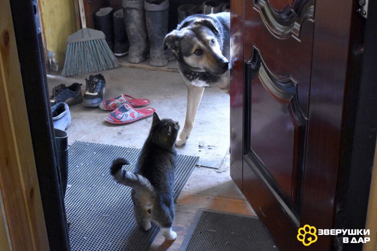 Со всеми собаками хочет дружить и играть. С кошками знакомили, но наедине не оставляли.