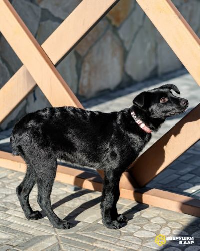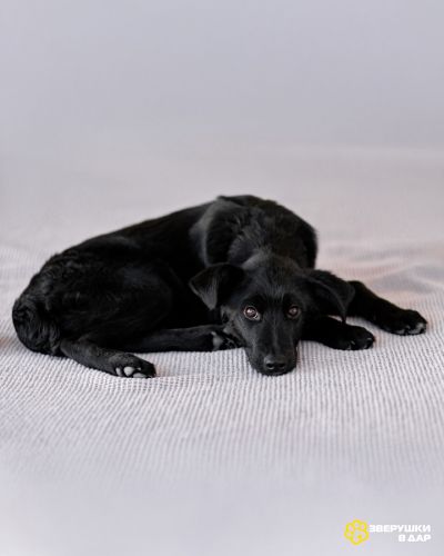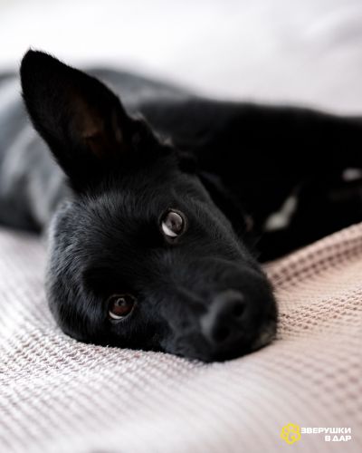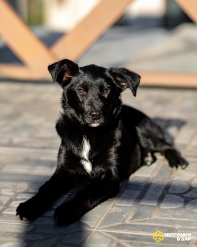 Молли — классическая чёрная собака-метис: острая мордочка, висячие уши, белый “галстук” на груди и удивительно умный взгляд. Эти собаки отличаются дружелюбным, весёлым и очень тёплым характером. Молли — именно такая, но при этом особенная.
