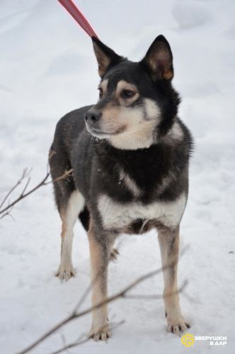 Дружелюбна с кошками и со всеми собаками, дети 5+. Умеет ходить на поводке, терпит 3х разовый выгул.